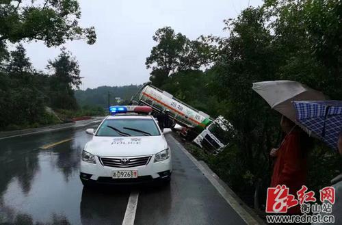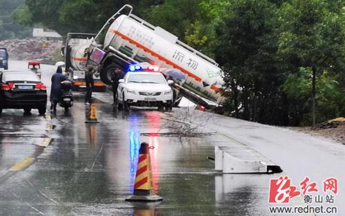 下雨天行车就应该小心谨慎,尤其在国道、高速公路等车辆密集的路段。10月21日上午,在107国道衡山县长江镇就出现了惊险一幕:一辆重型半挂牵引车在雨天行驶的过程中,由于路面湿滑,在拐弯途中驾驶员操作不当,造成了一起交通事故的发生。
