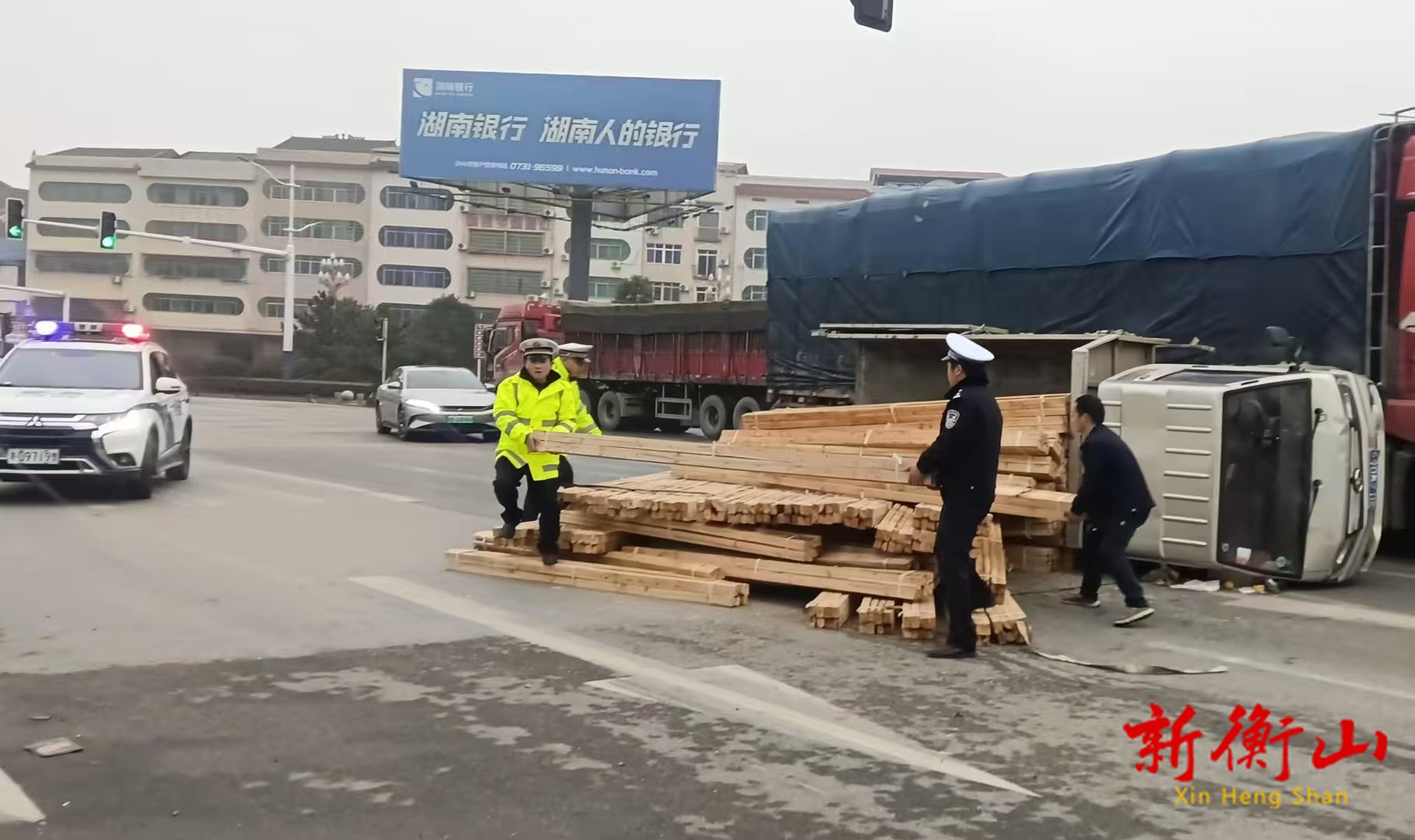 1月26日16时28分许,在衡山县G240国道与G107国道交汇处,一辆满载木材的小货车发生侧翻,货物散落一地,影响过往车辆正常通行。危急时刻,在周边巡逻的衡山县公安局交通警察大队师古中队民辅警迅速化身“救援员”与“搬运工”,高效处置险情。