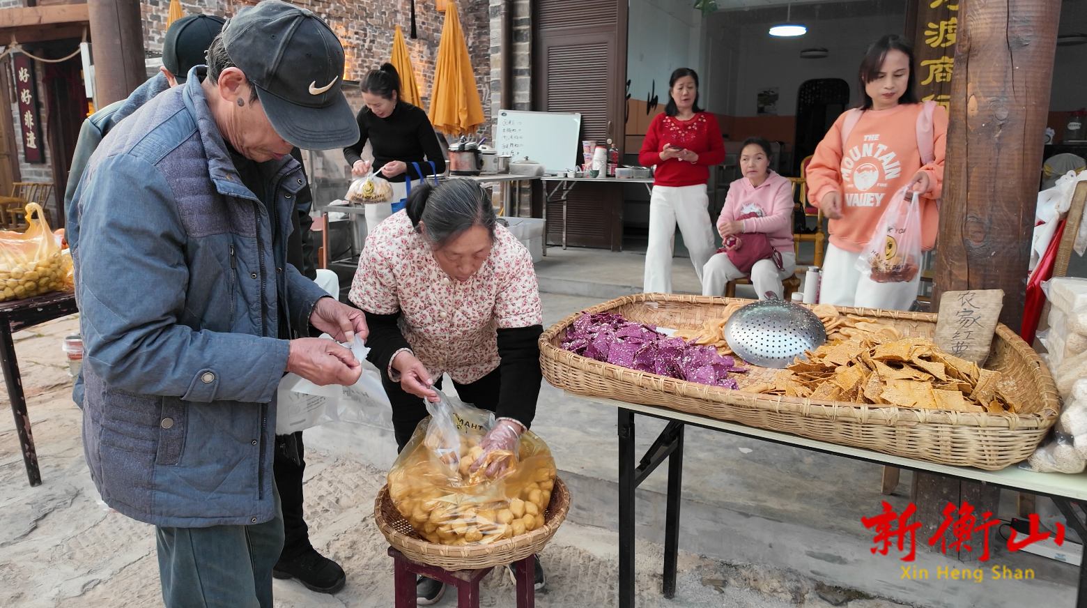 风土特色小摊零散地分布在渡口街巷不起眼的角落,但却是一个微缩的“风味博物馆”。核心是那一板板细嫩的衡山豆腐,以山泉与本地豆成就的滑润;旁边的竹筛里,琥珀色的红薯片、紫薯片泛着油润光泽,细细咀嚼,是阳光与土地交织的甘甜香脆,吸引了众多游客“打卡团购”。