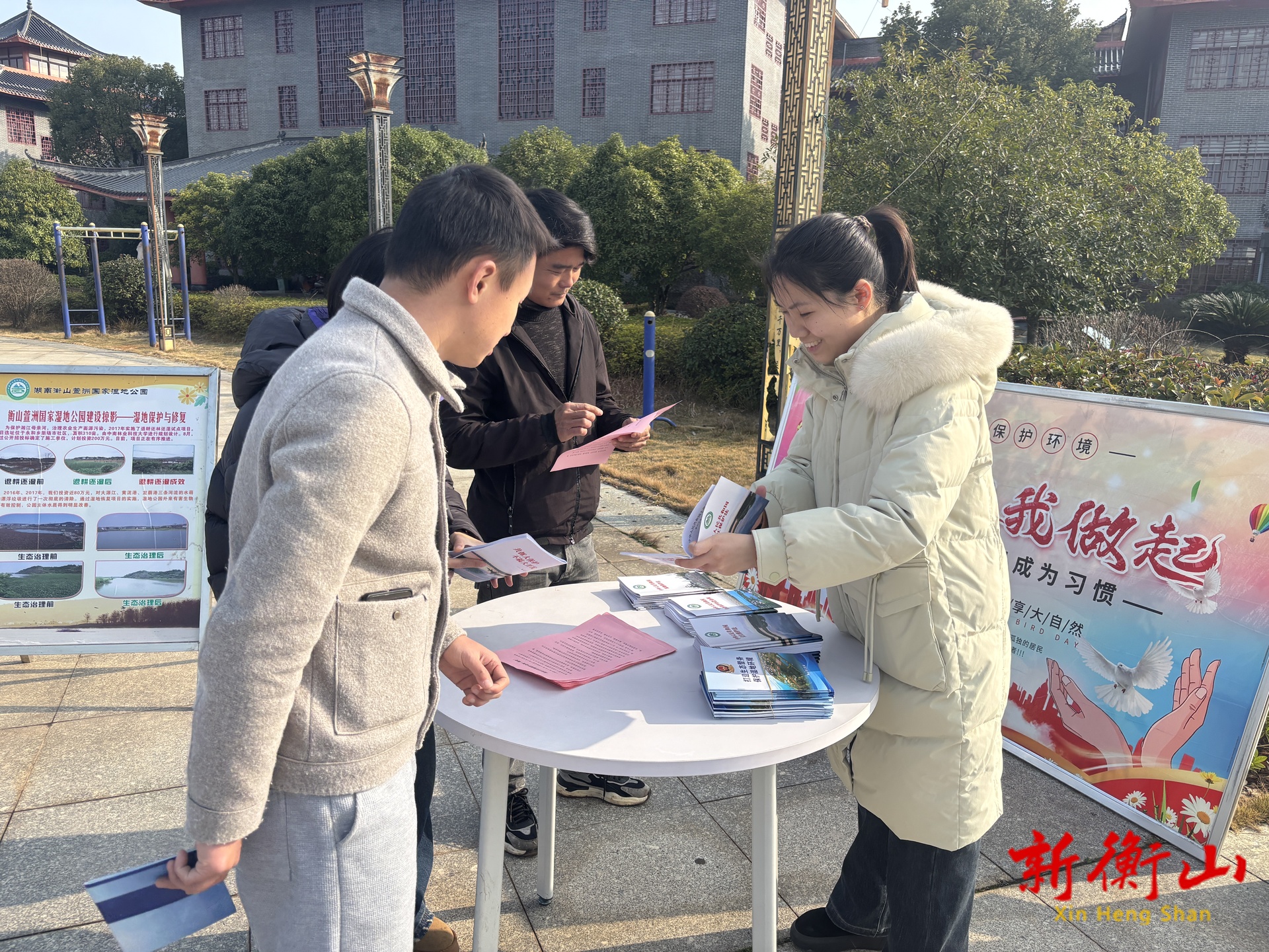 在萱洲华夏湘江前坪广场,湿地公园管理处同步开展线下科普宣传。摆放了湿地生态、珍稀动植物保护等主题展板,工作人员向群众发放宣传手册、法规读本,还赠送印有湿地元素的环保布袋、漱口杯等文创产品。面对面解答群众疑问,引导大家关注湿地公园官方微信公众号,让大家零距离了解湿地生态价值与保护意义。湿地公园管理处还精心制作阳辉同志的湿地保护纪实视频,镜头记录其多年投身湿地巡护、生态监测、科普宣传等工作的坚守与付出。通过各种平台推送,以一线工作者的榜样力量,鼓励更多人加入湿地保护队伍。