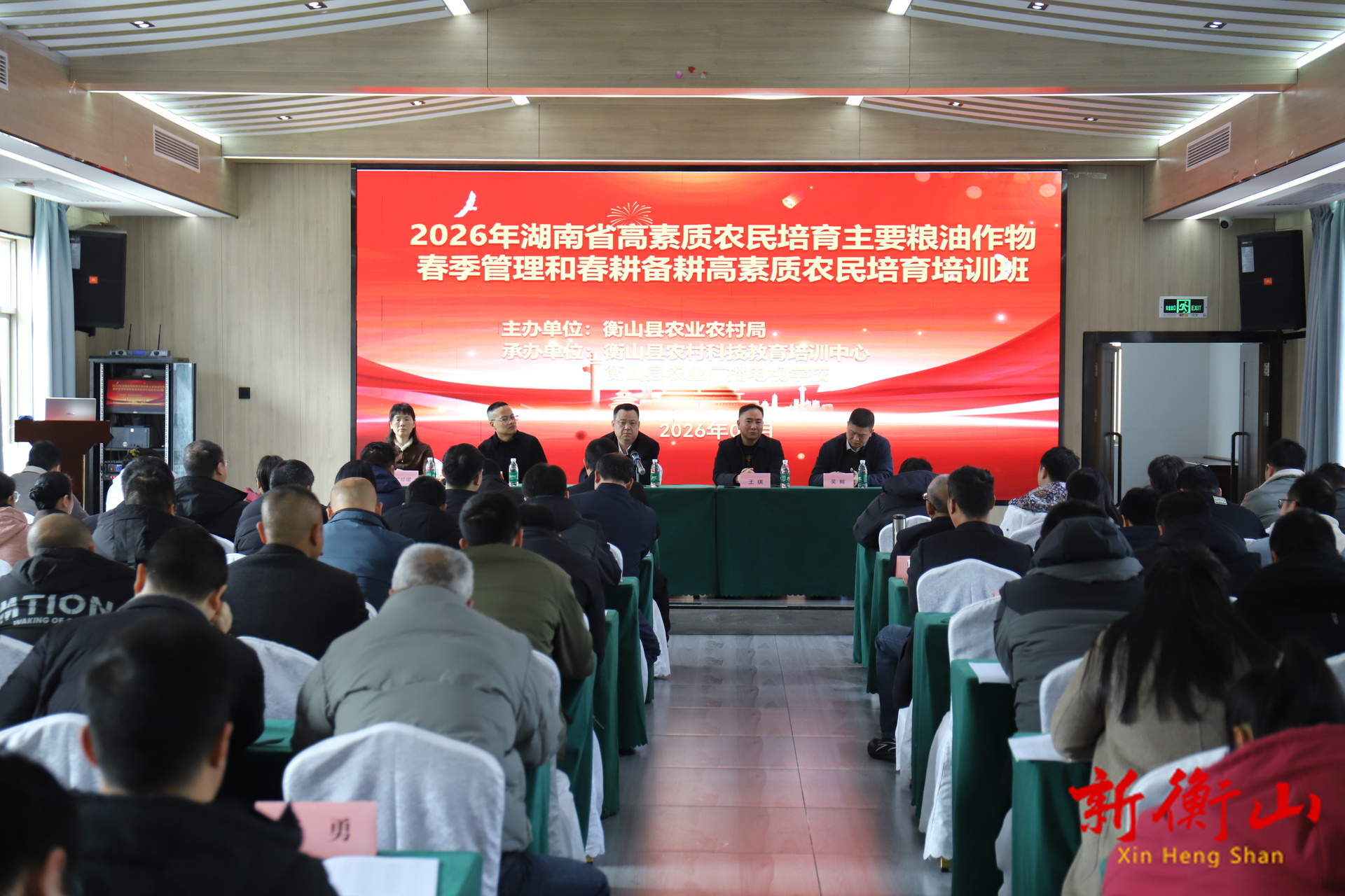 为深入贯彻落实国家粮食安全战略和中央农村工作会议精神,扎实推进春耕生产,切实提升全县粮油作物春季管理水平,3月5日,由衡山县农业农村局主办、衡山县农村科技教育培训中心(农广校)承办的“2026年衡山县主要粮油作物春季管理和春耕备耕高素质农民培育班”在麓园大酒店正式开班。