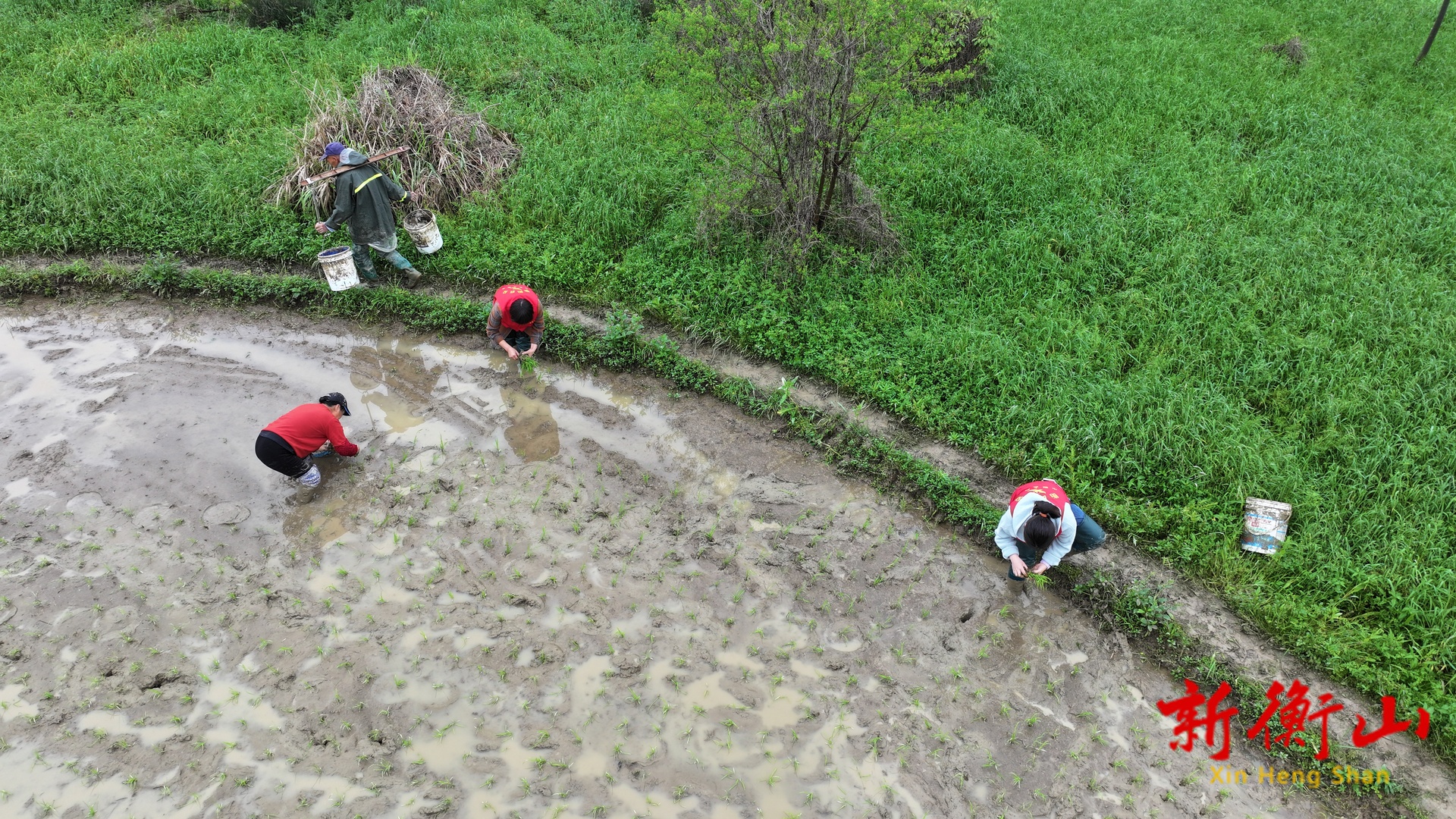 4月15日,衡山县东风社区十九组的田间地头一派繁忙景象。10余名身穿红马甲的党员干部与志愿者,挽起裤腿、俯身田埂,和当地农户并肩协作,将一株株嫩绿的秧苗插入水田。运秧的脚步匆匆,分秧的动作细致,插秧的手法娴熟,原本空旷的水田在众人的努力下,渐渐被整齐的秧苗铺满,宛如一块精心编织的绿毯,生动勾勒出“党群同心助春耕”的鲜活图景。