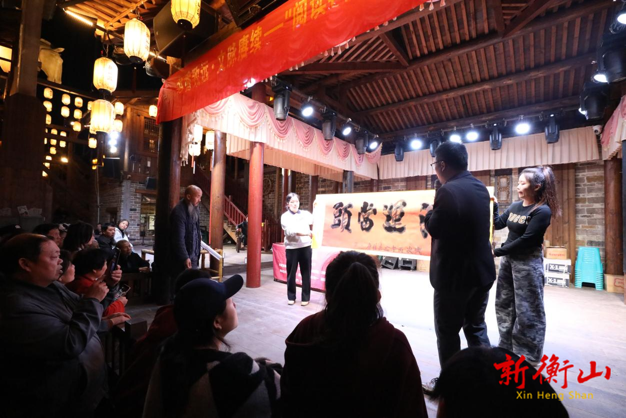 当晚,衡山县“书香致远·文脉赓续”全民阅读系列活动也同步进行。与皮影楼遥相呼应的民俗戏台上,衡山籍知名书法家受邀现场挥毫。一幅幅笔力遒劲、寓意深远的书法作品跃然纸上。书法家们还将部分题字赠予社区群众和青少年读者,鼓励大家“读好书、写好字、做好人”。剧团演员们带来了湖南经典花鼓戏《刘海砍樵》。熟悉的“胡大姐”“刘海哥”唱腔一亮,现场掌声与叫好声不断。